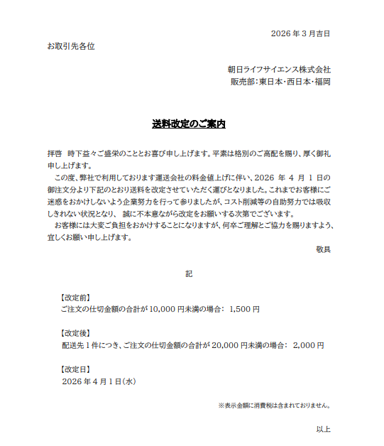 この度、弊社で利用しております運送会社の料金値上げに伴い、2026 年 4 月 1 日の御注文分より下記のとおり送料を改定させていただく運びとなりました。